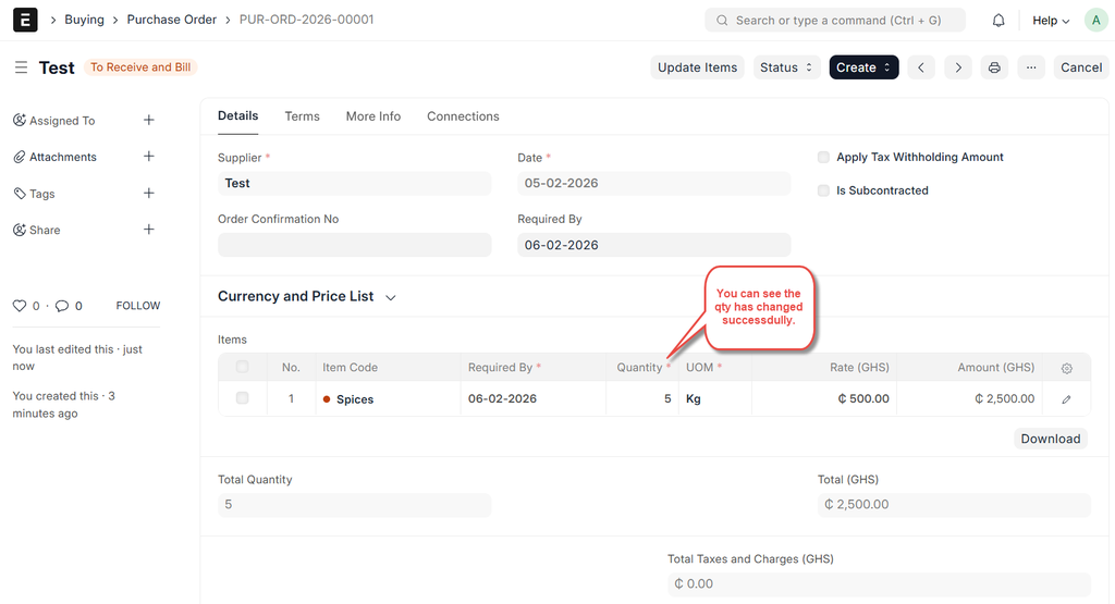 - ERPNext applies the updates to the submitted PO