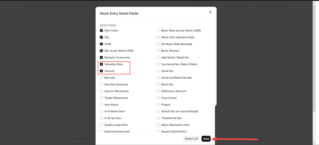 - Select the fields you want to show (for example, Valuation Rate, Amount)