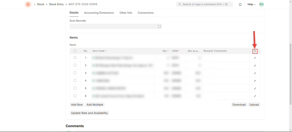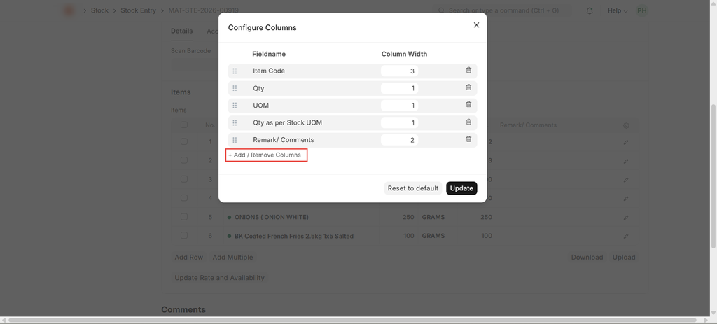 IntermediateERPNext allows you to customize the columns shown in a child table, such as the Items table in a Stock Entry. You can add or remove fields and adjust column widths to suit your data entry needs.
