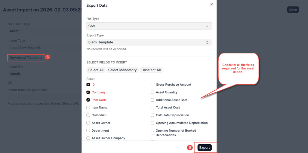 Enter asset details in the template. Ensure accuracy for all mandatory fields, including: