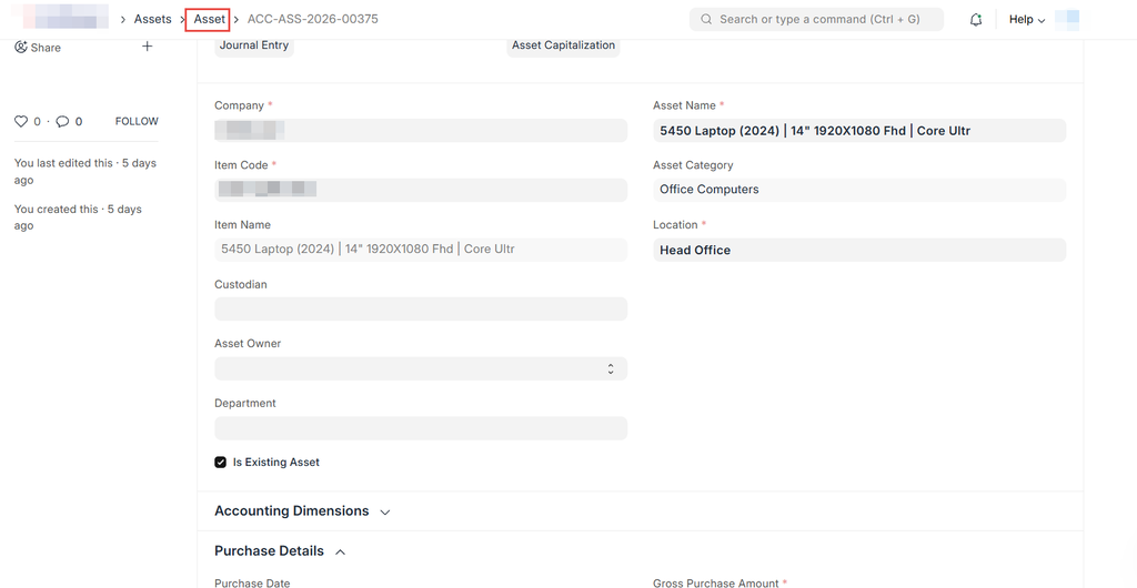 Confirm that Asset Categories are already created with correct depreciation settings, including useful life, depreciation method, and frequency.