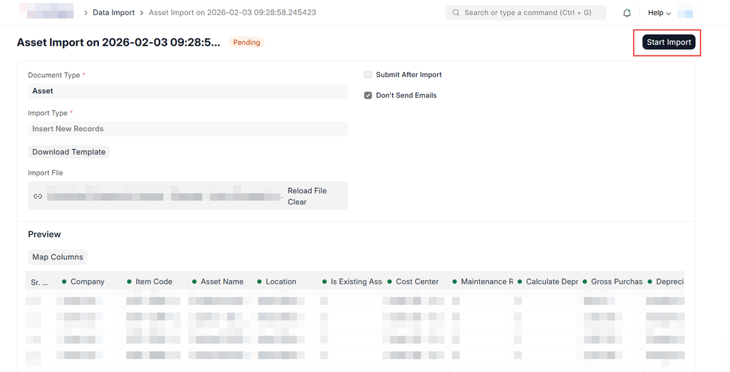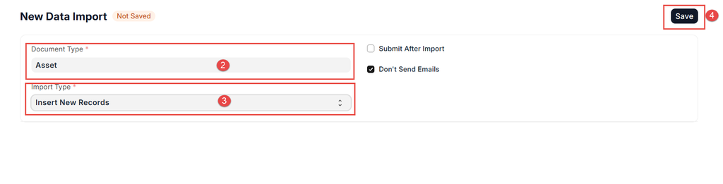 Select Asset as the document type and choose Import Type: Insert New Records.