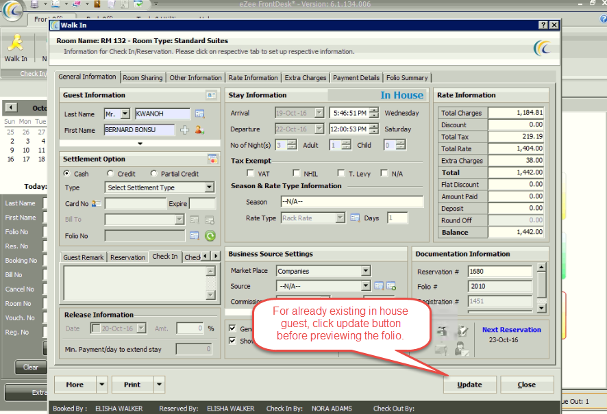 - Restart eZee Frontdesk the new template will display automatically for new guest check in. To get the invoice to display also for existing guest, then once you open a room for any in house guest, click on update button.