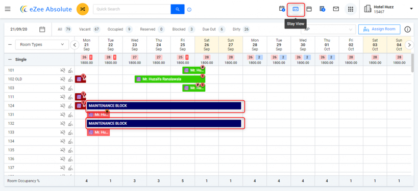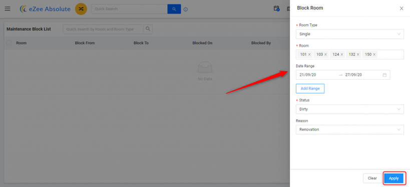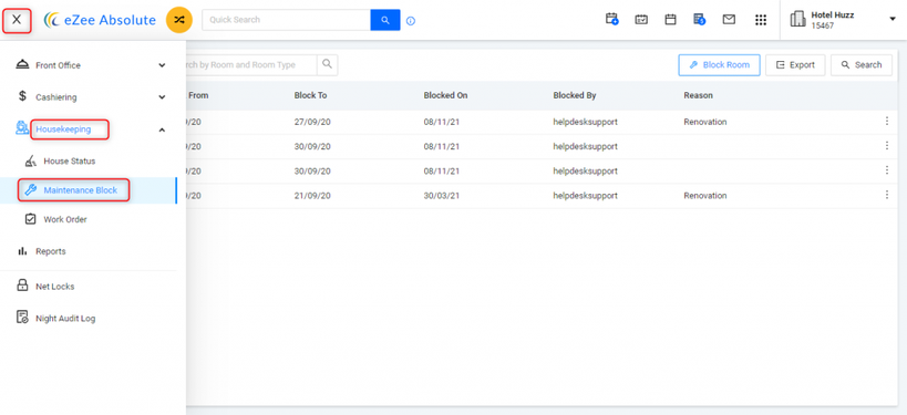 Navigate to: Menu (≡) > Housekeeping > Maintenance Block.