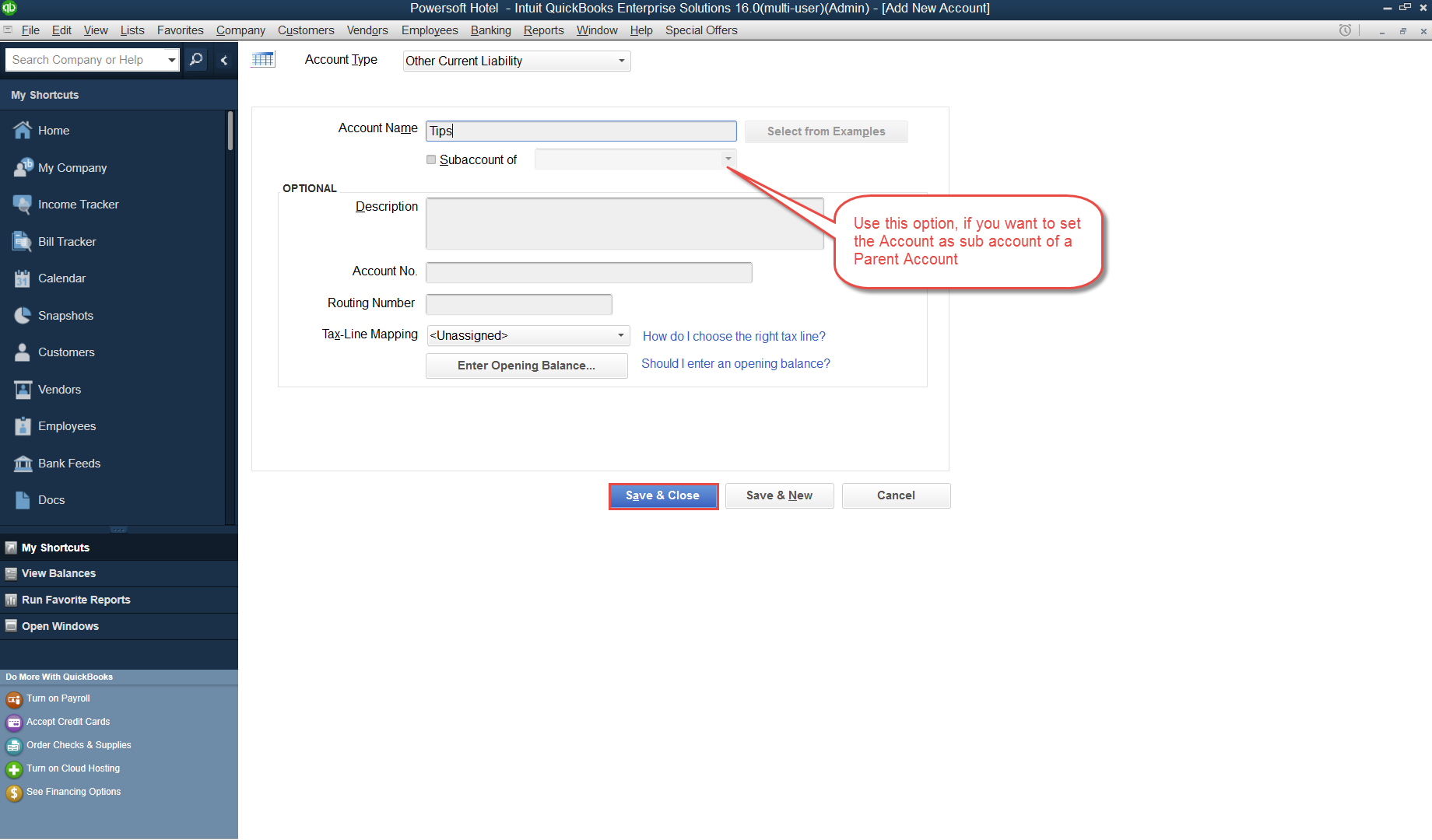 Step 5. Input the name of the Account and Click Save & Close. Check below given screenshot.